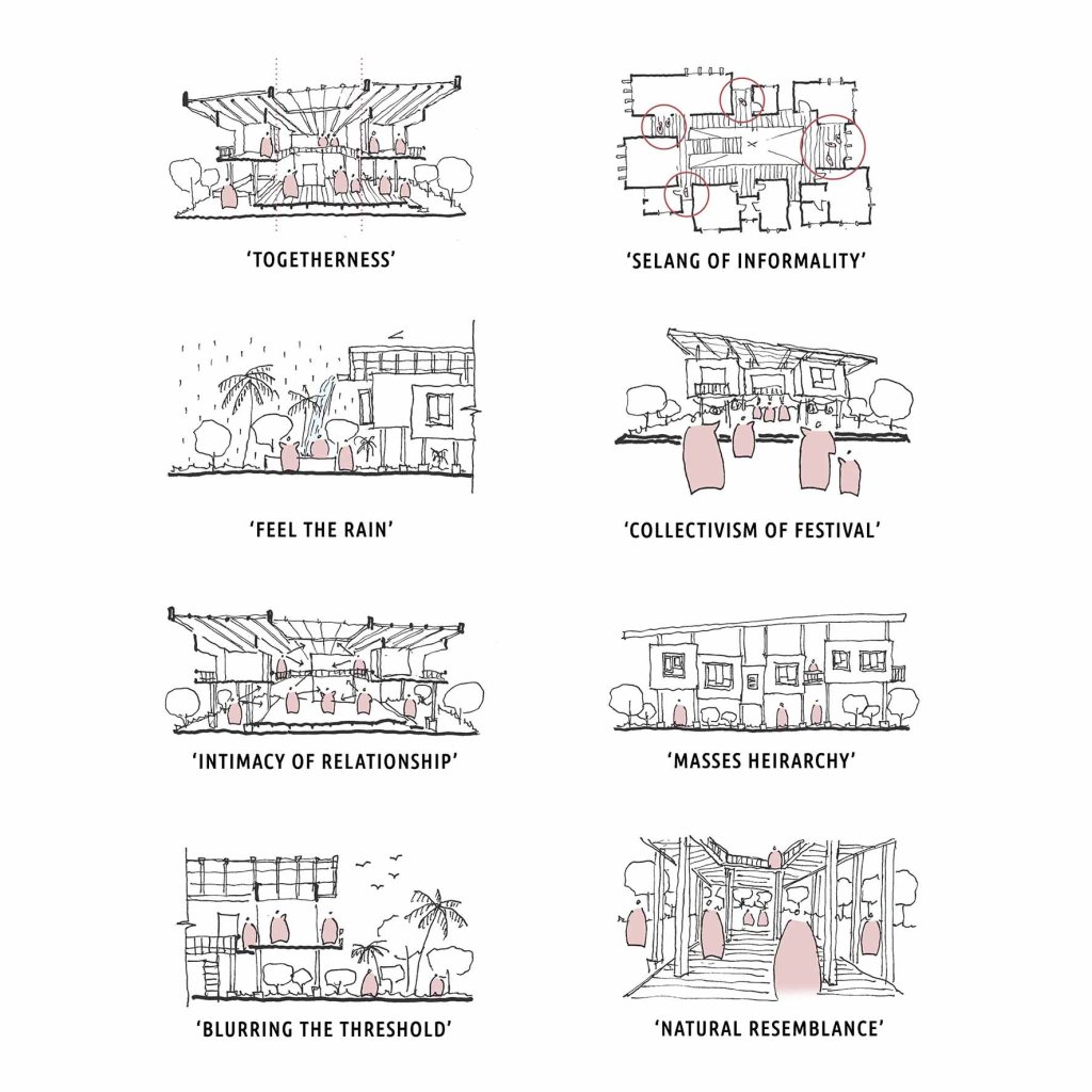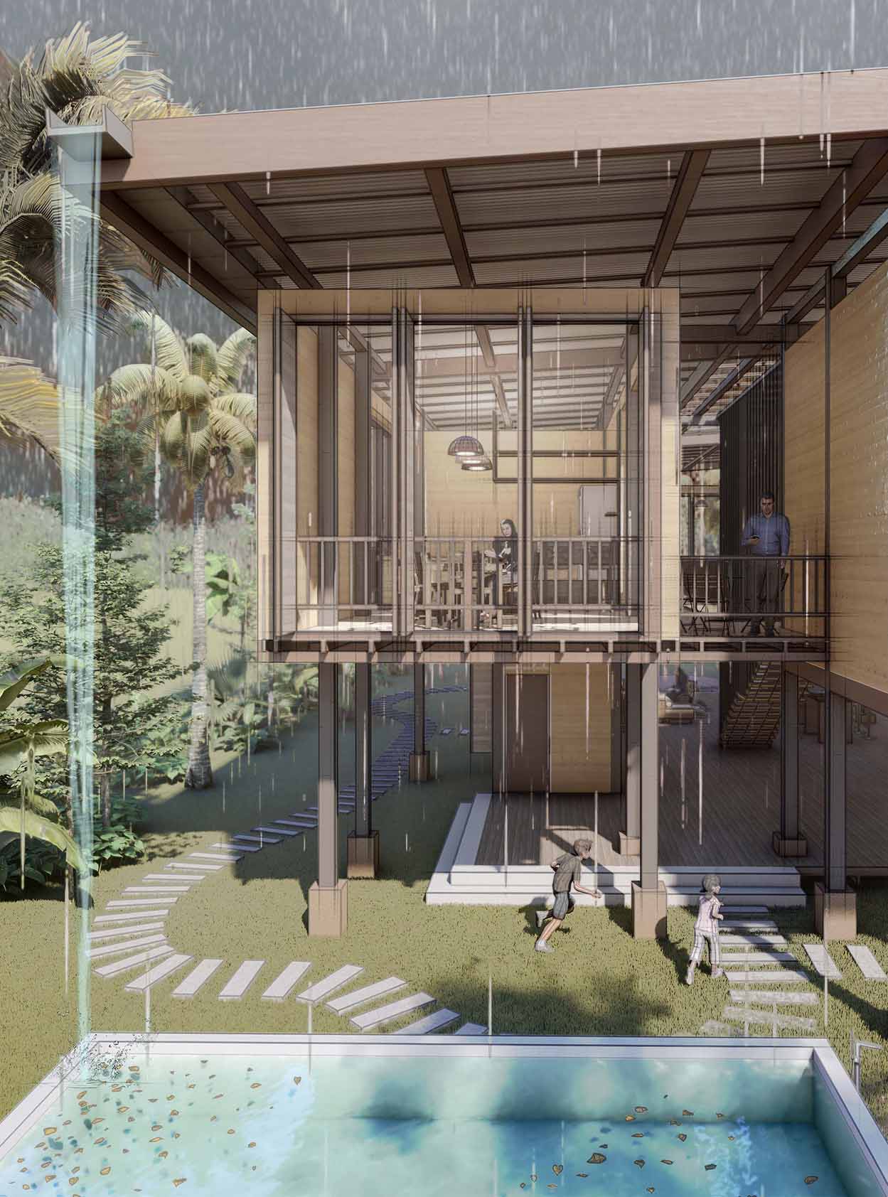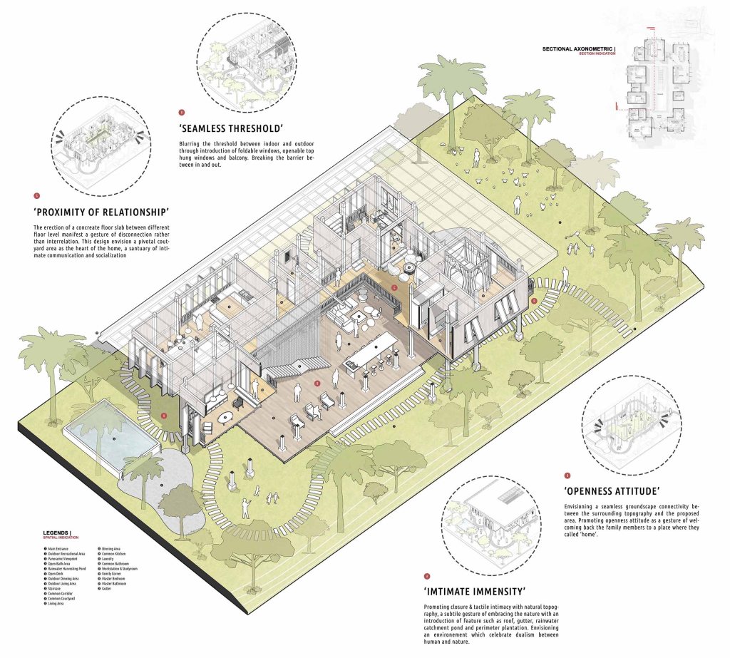 The design of this Malaysian House intended to live up towards the premise of reminiscing the bygone moments; a place that recalls back the forgotten collective memories of our ‘Kampung’ lifestyle – a place that we once called home. 8 points of bygone moments were formulated and implemented into our design proposal where those points are: [1] Togetherness; courtyard as the ‘heart’ of the home, [2] Selang of Informality; accidental spaces for informal reconnection, [3] Feel the Rain; roof, gutter and pond which respond to the hot and humid climate of Malaysia, [4] Collectivism of Festival; open groundscape area for festival celebration, [5] Intimacy of Relationship; slabless connection between the ground and upper level, [6] Masses Hierarchy; levelling between spaces as a gentle buffer between privacy and spatial hierarchy, [7] Blurring the Threshold; merger of windows and balconies (like a balconette) and last but not least [8] Natural Resemblance; architecture on silt to be resemblance nature and achieve harmony between natural environment and built architecture.