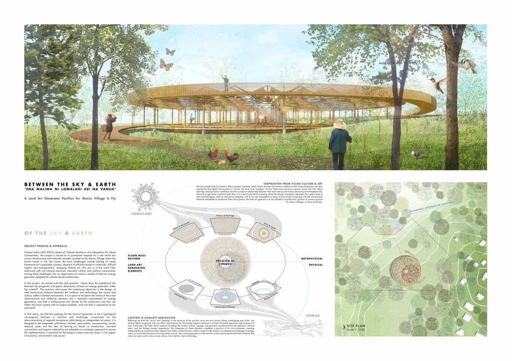 Framed within LAGI 2025’s theme of ‘Climate Resilience and Adaptation for Island Communities’, the project is bound to its contextual respond for a site which has scarce infrastructure and remotely located. Located at the Marou Village within the Naviti Island in Fiji, this raises the local challenges include lacking of ready framework for sustainable systems, absence of efficient toolset or materials, difficult logistic and transportation, changing climate etc. The site is at the same time, embraced with rich natural resources, beautiful culture, and resilient communities, turning these challenges into an opportunity to create a model of land art energy generator adapted for remote island communities.