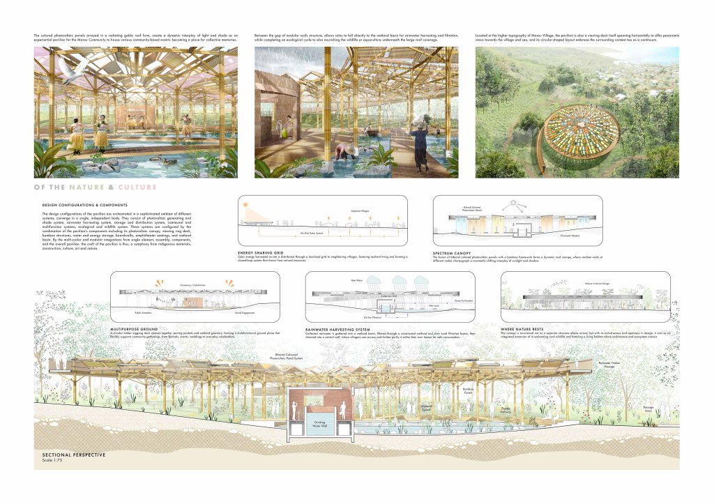 In this project, we started with the vital question: ‘where does the equilibrium lies between the pragmatic and poetic dimensions of land art energy generator within Fiji context?’ This question also poses the underlying objectives in the design, to seek harmonious balance between the tradition and technology, the nature and culture, within a limited environment. It is a quest to transform the notion of the usual infrastructural and utilitarian elements into a beautiful embodiment for energy generation- one that is multipurpose and shared by the community, one that can reflect the local context with its unique aesthetic, and one that is inspired by its sky and earth.