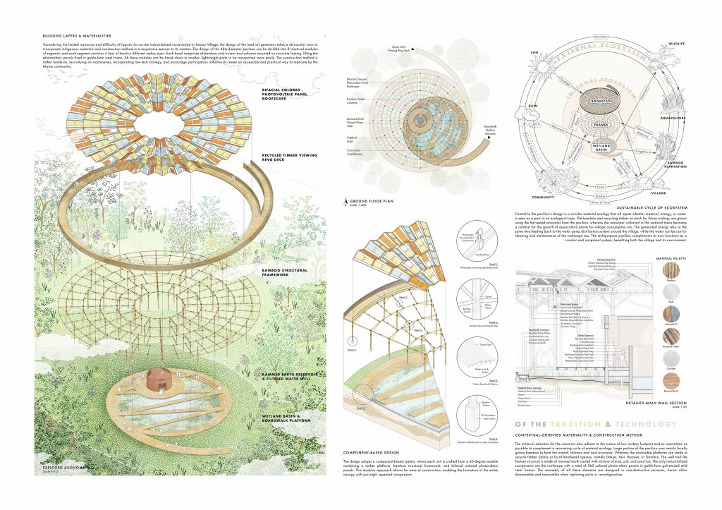 In that sense, we find the typology for the land art generator to be a typological convergence between a structure and landscape, constructed via the interconnectivity of regional ecosystems while being an independent art piece. It is designed to be integrated, self-reliant, resilient, zero-carbon, incorporating circular material cycle, and the idea of ‘leaving no traces’ in construction. Low-tech construction and organic materiality are adopted as a strategic approach to assure the implementation is practical for the project context and cost lesser in the aspect of economy, environment, and social. The pavilion upholds its ethos as the resources and material ecology that mirrors nature’s cycles. Every input- whether material, energy, or water- to be seen as a part of a loop rather than a one-way transaction.