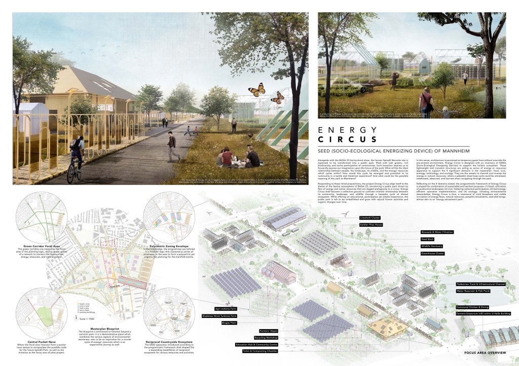 Alongside with the BUGA 23 horticultural show, the former Spinelli Barracks site is expected to be transformed into a public park- filled with lush greens, rich biodiversity, and active participation of communities. Such transition inspires us to forwardly express our imagination upon the future of the park: What will be the ideal relationship between people, the landscape, its wildlife, and the energy/ resources which cycles within? How would this cycle be emerged and prevailed to its community in a tactile and theatrical experience? And what could be the possible meaning of this park to Mannheim?