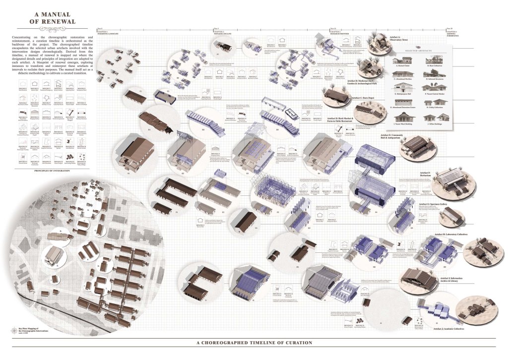 Concentrating on the chronographic restoration and reinstatement, the curation timeline is orchestrated as the backbone of the project. The choreographed timeline encapsulates the selected urban artefacts involved with the intervention designs chronologically. Derived from this timeline, a manual of renewal is mapped out where the designated details and rules of integration are adapted to each artefact. A blueprint of renewal emerges, exploring instances to transform and reinterpret these artefacts at intervals to reclaim their purposes. The manual itself act as a didactic methodology to cultivate a curated transition.