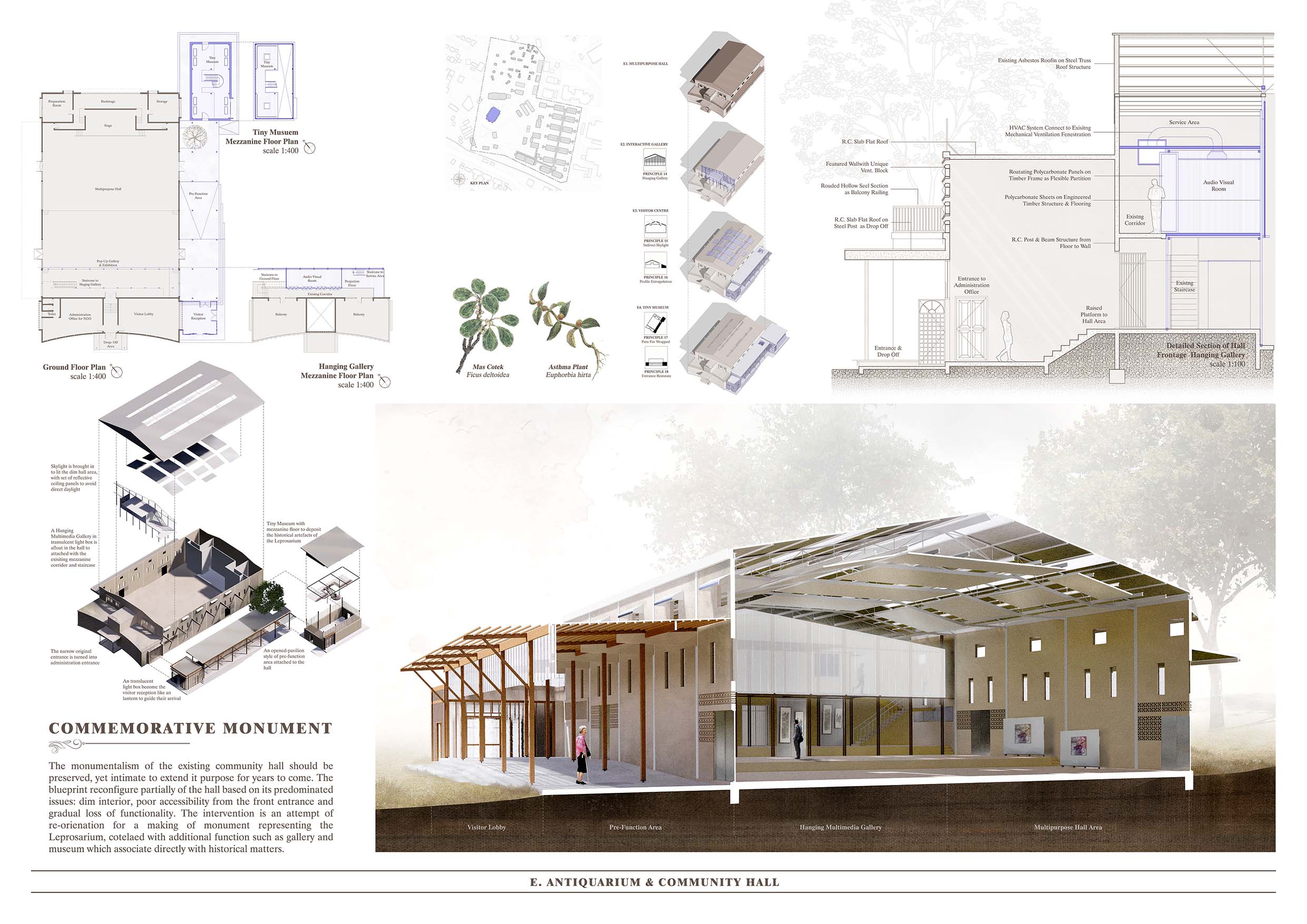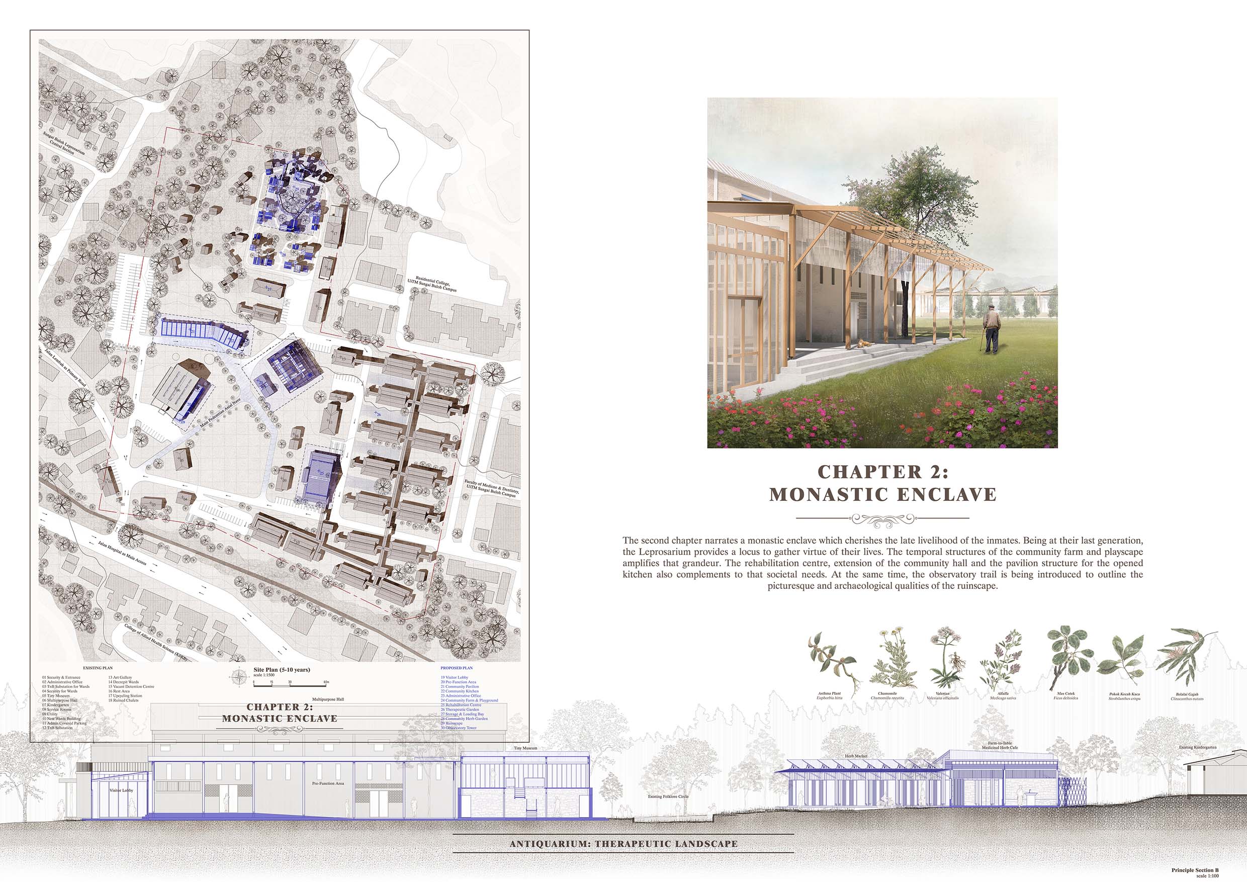 By aligning these surveys at conjunction, the design thesis is shaped to envisage 3 objectives: (1) the ideological objective- to construct a new perspective towards timelessness in architecture by speculating the changing relationship between artifices, nature and history; (2) the design objective- to reinstate the tangible and intangible heritage of the Leprosarium with a set of time-based interventions in a manual of renewal; and (3) the programmatic objective- to create a reciprocal platform in a chronographic blueprint which reacts to a changing programmatic framework. By inventorying the data collected from various contextual spectrums, it becomes a critical tool to inform the multiscalar decision-making in the thesis- unraveling the enigmatic perceptions to tangible measures.