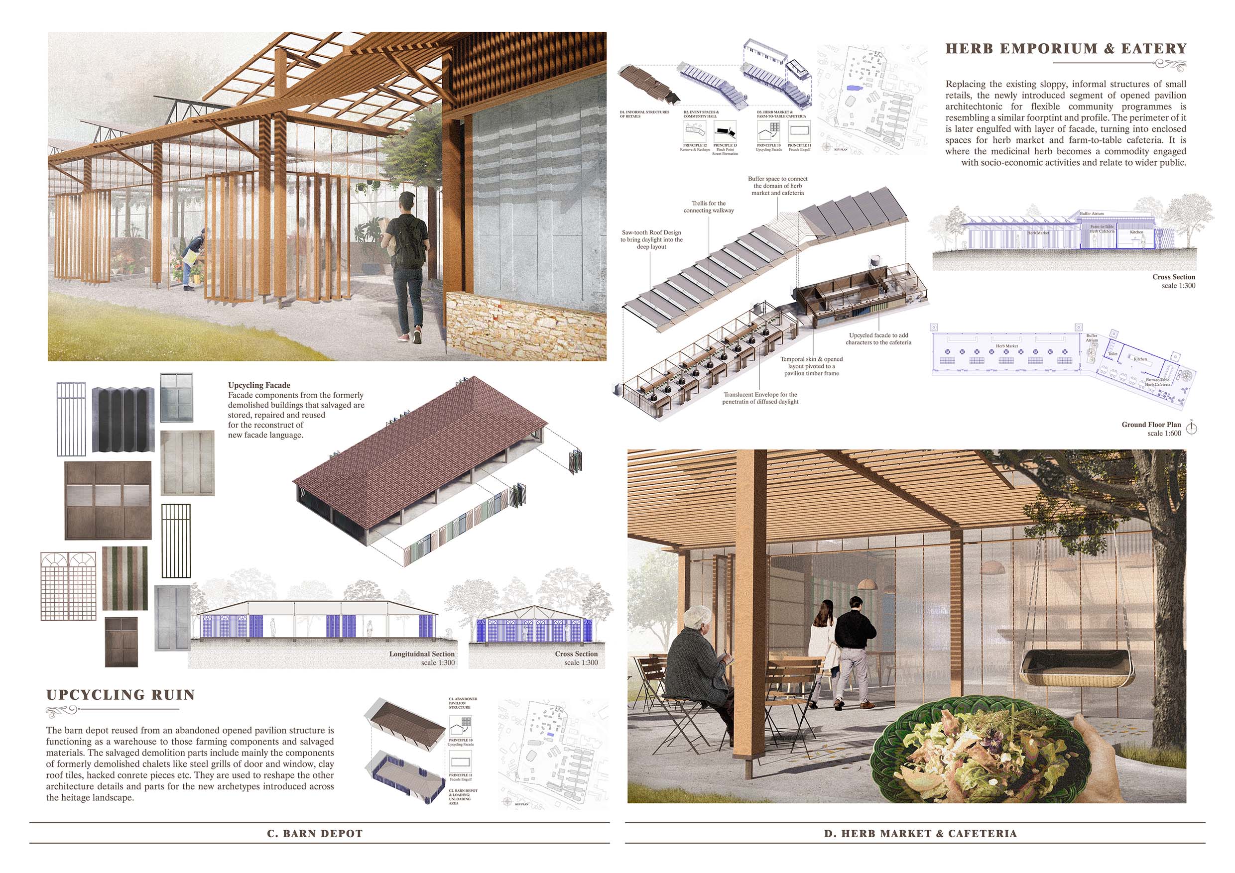 The first chapter unveils a story about inhabiting landscape. Focusing at the ruinscape area that was deserted upon the decrease of the native population, this design phase is pioneered by the communistic initiation with bottom-up strategy to reclaim the wild stretch. The ruined chalets are restored as tiny greenhouses complementing a community herb garden, whereby the dilapidated structures are upcycled into various gardening modules. An empty pavilion-style building is turned into a barn depot supporting the herb garden as a service and storage centre. A productive landscape is cultivated here.