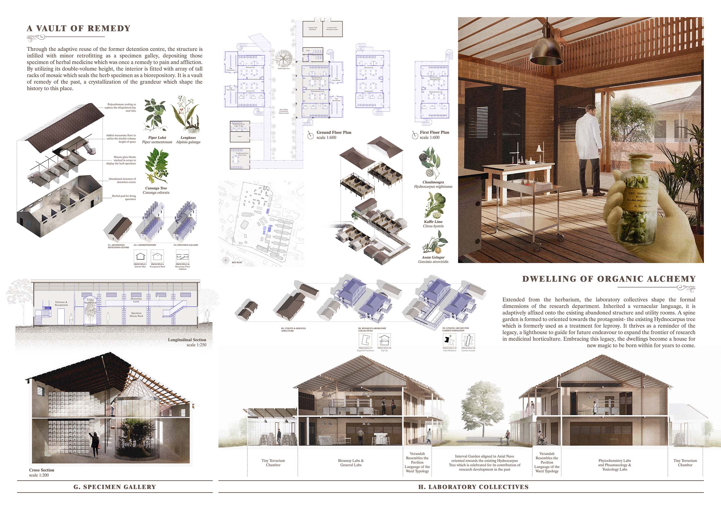 The third chapter is followed by the formation of a research frontier. Over a decade followed by the fading of the inmates, the Leprosarium shall return to its authority with reinstatement for a medicinal research purpose. Engulfed with translucent envelope, the vacant pavilion is transformed into an herbarium, a centre for conditioned nursery and research activities. It traces the typology of a greenhouse integrated with specialized infrastructure for various herb species. Whereas the former detention centre is reused as a specimen gallery adjacent to the herbarium. In addition, the laboratory collectives are integrated with the heritage landscape, pivoted to the existing Hydnocarpus Tree which was celebrated as a treatment to leprosy in the past.