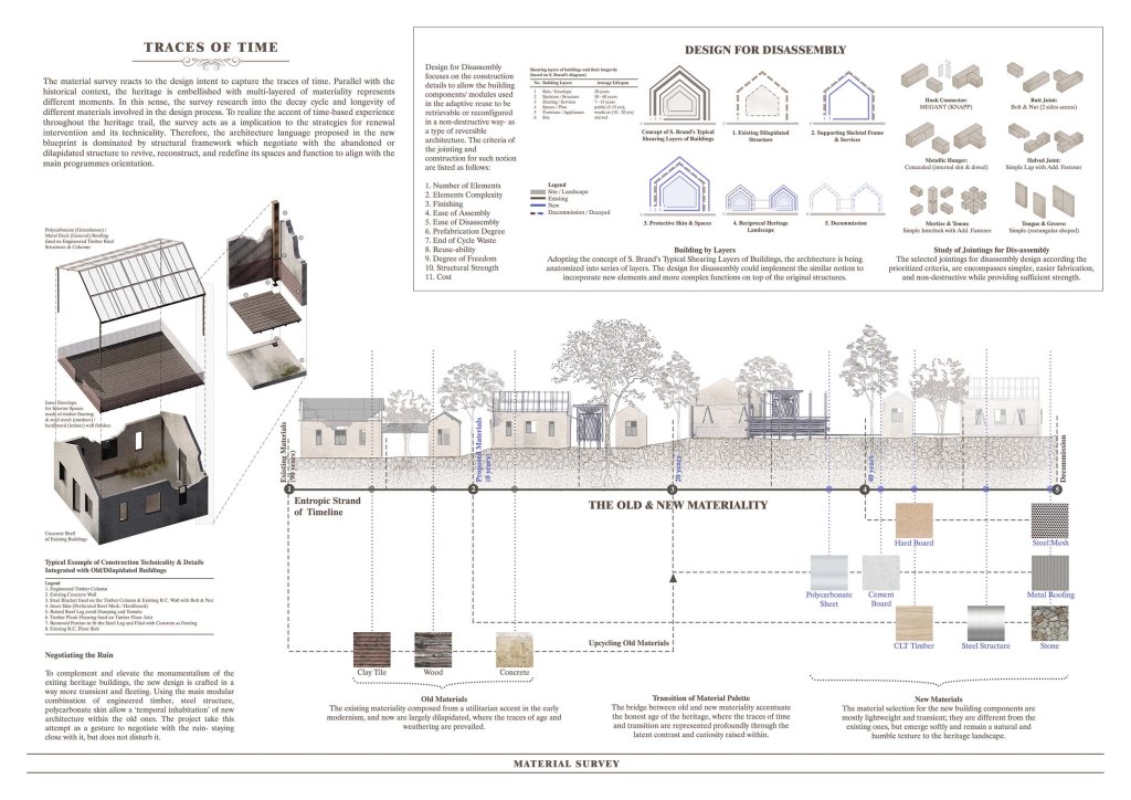 Correspondence to this approach, the architecture design is constructed as a narrative body to those relics of past and traces of times. The restorative architecture adopts a combination of fleeting and transient materiality, touching the heritage fabric and landscape extremely lightly. This idea of assembly and disassembly minimizes the impact and footprint to the heritage, enabling them not only to be disappeared decades later, but also easily decay as part of nature within a designated timeframe. Design is complementary to the protagonist- a tale of ephemerals within the artifice, nature, and history of Sungai Buloh Leprosarium.
