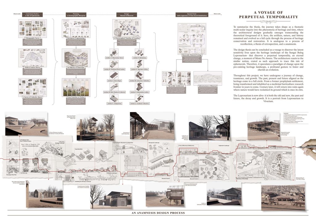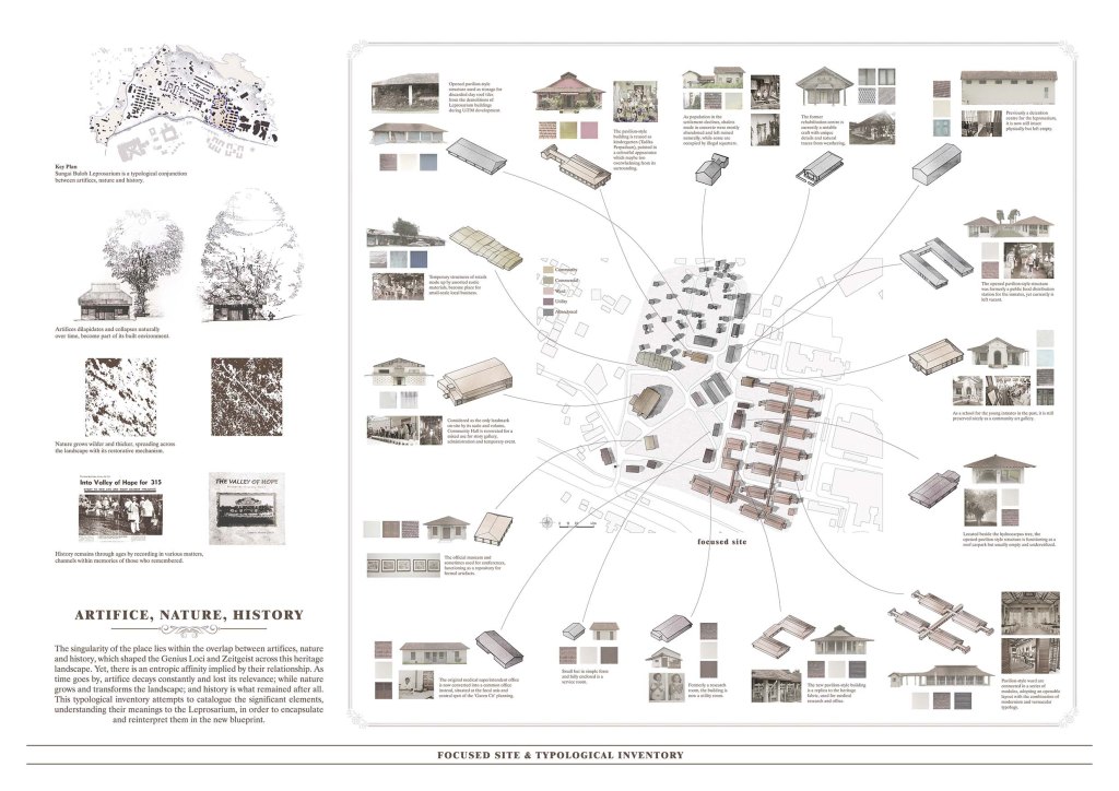 Based on the ethnographic survey, known as ‘Valley of Hope’, Sungai Buloh Leprosarium once had a prophylaxis past. Since its establishment in 1930, the Leprosarium is currently a 90-years old living heritage born upon an epidemic tension. It thrives as a self-supported community with a long history of conforming, confronting, and compromising with nature. This process is analogous to the cyclical process of damaged and recovery lies within the patients, the landscape, the artifices, and the heritage.