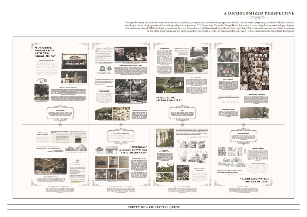 However, through the survey of a collective quest between the stakeholders, it implies the dichotomized perspectives within. The authorized proprietor, Ministry of Health Malaysia is seeking to foster the progression of the heritage with new programmes. The Community Council of Sungai Buloh Settlement is concerning the mnemonic safeguarding for civic mnemonic instead. While the leprosy inmates at their last generation, are all about recollecting the virtues of their lives. The communities around and public are passive on the other hand, perceiving this place a possible reciprocal part with surrounding institutions apart from its medicinal and horticultural dimensions.