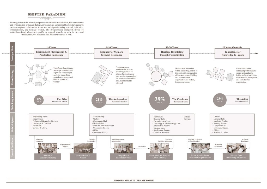 Anchored to this framework, the thesis begins with reciprocal programming and chronographic planning. Inherent from its medicinal past and horticultural present, the reinstatement of Sungai Buloh Leprosarium is projected into the making of a Medicinal Horticulture Research Frontier for the years to come. It consists of the peripherals of the atlas (landscape department), the antiquarium (visitor department), the cerebrum (research department), and the artery (education department). They grow gradually as part of a coherent system to connect with the surrounding context, sharing the reciprocity between the other medicinal, education and horticultural facilities around.