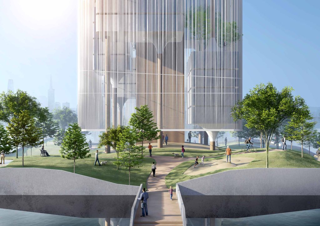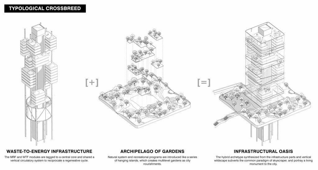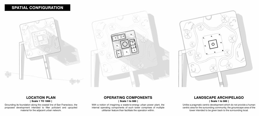 Apart from an infrastructural megastructure, Funnel-scraper is designed as a hybrid typology to accommodate multilevel gardens as public and recreational spaces to the compact city as well. Parallel to its notion to rewilding the cityscape, the gardens infill has diverted the image of the ‘infrastructure’ appearance of the tower, to become more human-centric and intimate. It resembles the architecture not only as an eco-apparatus to address and relief a long-existing environmental strain, but a living monument of the urban context and its dweller too. The architectural virtues from this hybrid archetype of waste-to-energy mechanism and the hanging gardens suggest a completely new urban experience. Standing along the bay as an island, the gardens are projected as floating archipelago on the sky- it is a journey of vertical wildscape, an urban amusement, an oasis of San Francisco.