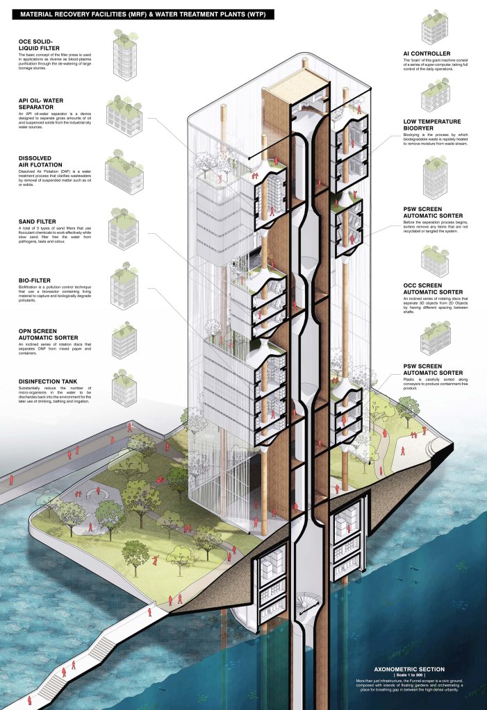 In response to such issue hoarded over decades, the Funnel-scraper is envisioned to be a contextual-driven solution as a waste-to-energy power plant tower. Situated at the coastline of San Francisco which is one of the prominent cities located within the vortex cycle of Great Pacific, the tower filtrates the polluted seawater while generating energy and upcycled materials to the adjacent urban network. It incorporates modules of Material Recovery Facilities (MRF) and Water Treatment Plants (WTP) to recycle the garbage patch through the dual circulation system: the pump of seawater from bottom-up and the funnel from top-down. It restores not only the marine ecosystem and its living habitat, but giving resurrection to the floating waste for its new purposes.