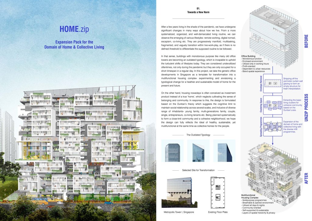In that sense, buildings with monotonous purpose like many old office towers are becoming an outdated typology, which is incapable to uphold the turbulent shifts of lifestyles today. They are considered underutilized oftentimes, not only during the pandemic but they are only occupied for a short timespan in a regular day. In this project, we take the generic office developments in Singapore as a template for transformation into a multifunctional housing complex- experimenting and envisioning a typological change for a heathier and sustainable model of home for the present and future.