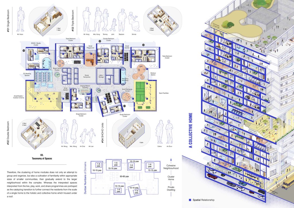 To generate the grounded sense of belonging and community, the design aims to extend the domain and sensation of ‘home’. The modules of home for different inhabitant types are designed and clustered specifically to the suitable sizes according to the Dunbar’s Number. These group sizes are then being bridged across with the live, play, work, and share programmes to expand the notion of ‘home’ in the scale from small to large, from private to public.