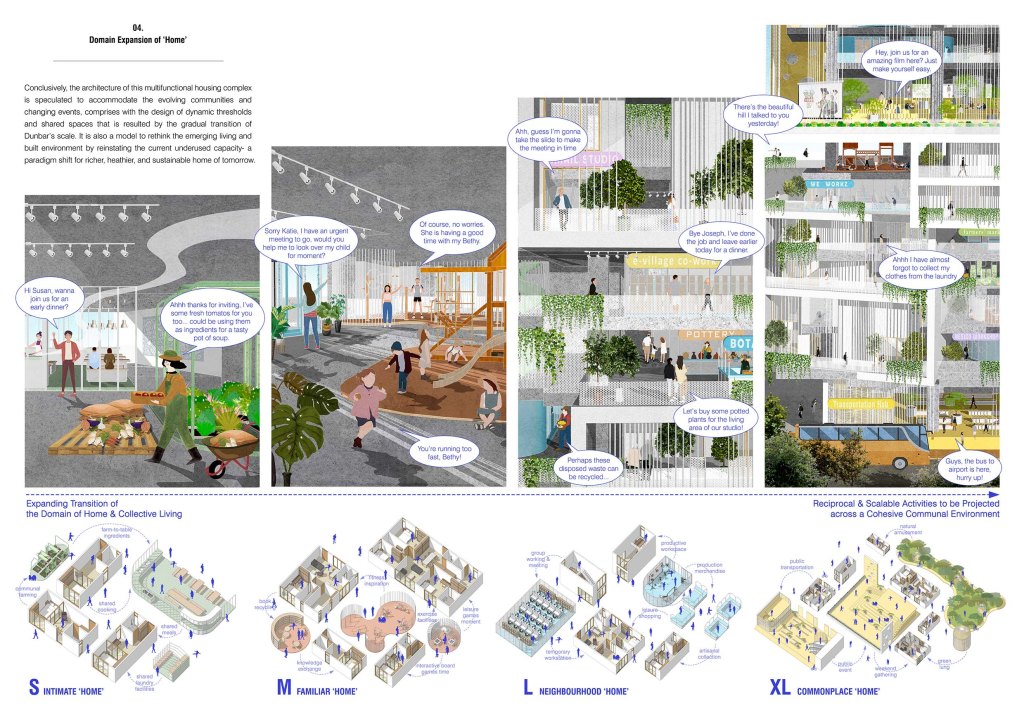 Conclusively, the architecture of this multifunctional housing complex is speculated to accommodate the evolving communities and changing events, comprises with the design of dynamic thresholds and shared spaces that is resulted by the gradual transition of Dunbar’s scale. It is also a model to rethink the emerging living and built environment by reinstating the current underused capacity- a paradigm shift for richer, heathier, and sustainable home of tomorrow.