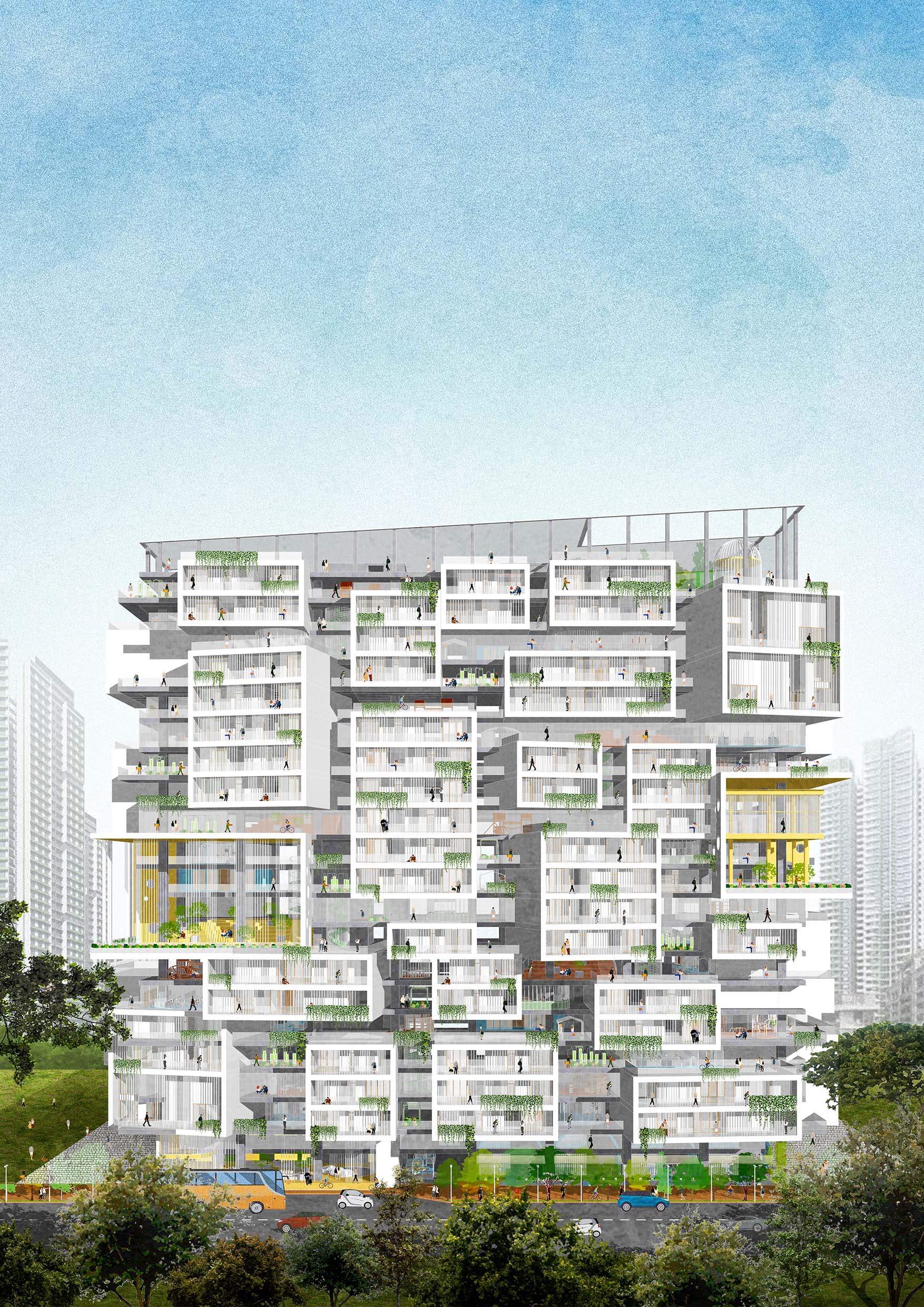 On the other hand, housing nowadays is often conceived as investment product instead of a true ‘home’, which neglects cultivating the sense of belonging and community. In response to this, the design is formulated based on the Dunbar’s theory which suggests the cognitive limit to maintain social relationship across several scales, and inclusive of diverse range of inhabitants- young family, multi-generations family, couple, single, entrepreneurs, co-living tenants etc. Being planned systematically to form a close-knit community and a cohesive neighborhood, we hope the design can fully reflects the ideal of healthy, sustainable, yet multifunctional at the same time as collective homes for the people.