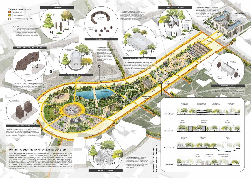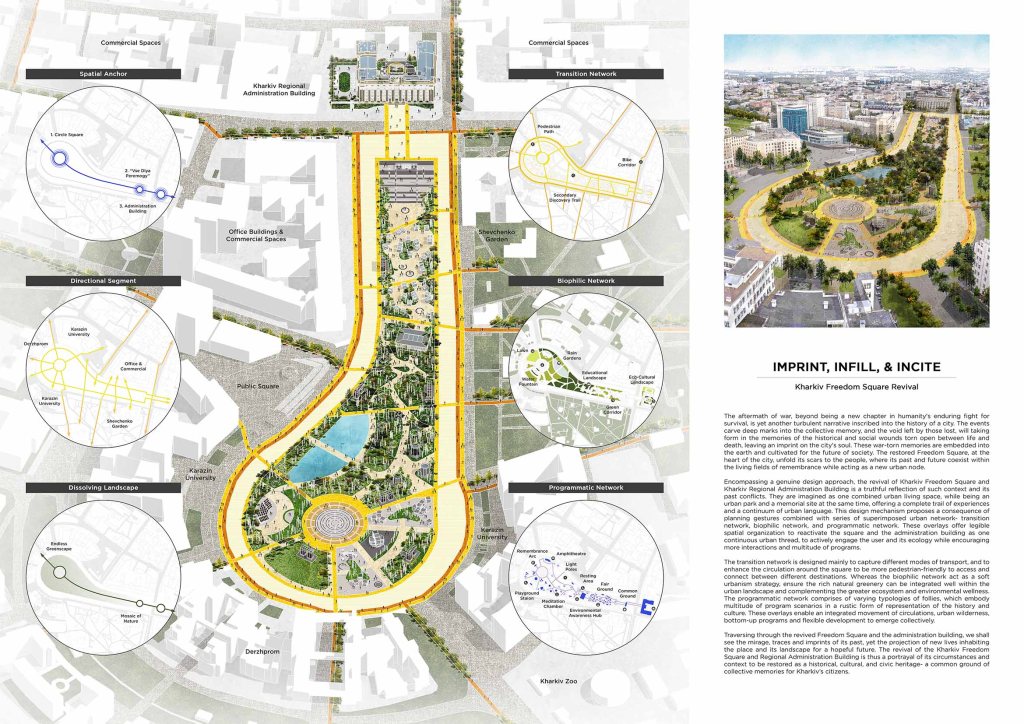Encompassing a genuine design approach, the revival of Kharkiv Freedom Square and Kharkiv Regional Administration Building is a truthful reflection of such context and its past conflicts. They are imagined as one combined urban living space, while being an urban park and a memorial site at the same time, offering a complete trail of experiences and a continuum of urban language. This design mechanism proposes a consequence of planning gestures combined with series of superimposed urban network- transition network, biophilic network, and programmatic network. These overlays offer legible spatial organization to reactivate the square and the administration building as one continuous urban thread, to actively engage the user and its ecology while encouraging more interactions and multitude of programs.