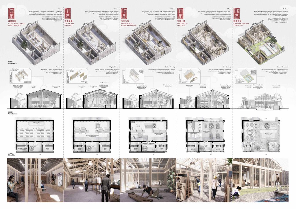 With a contextual premise to protect and safeguard the local Lingnan Culture, and a bigger proposition to scrutinized the relationship between dilapidated building and the embodiment of cultural inheritance, this development intended to amalgamate the architecture essence of both past and present; the old and new. This proposal envisioned journey connecting these heritage artefacts to offer a time-based spatial experience which inherits the authenticity of it’s collective memories.