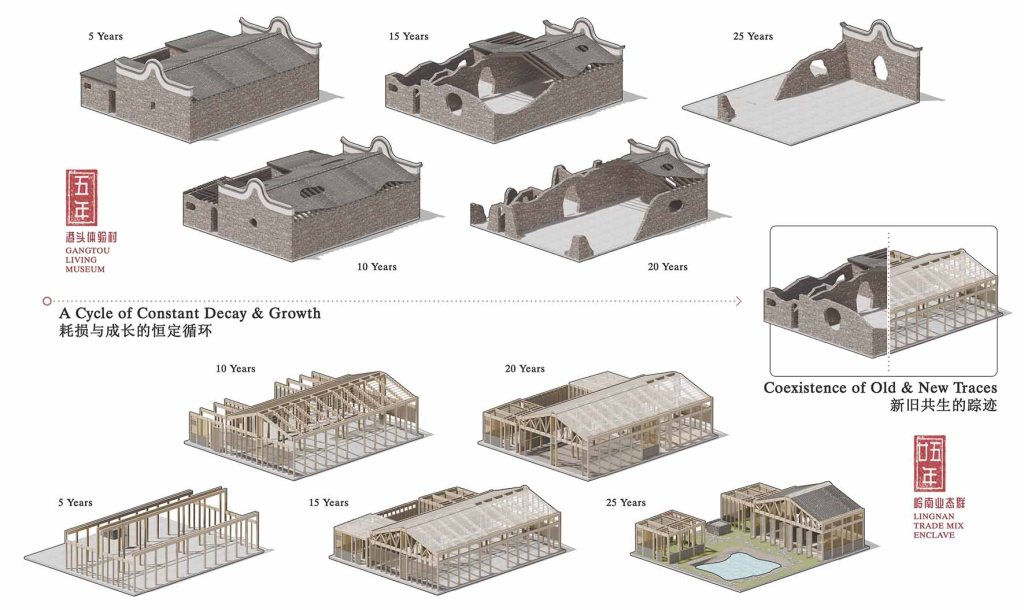 Within the context of Gangtou Village, this proposal shall position itself as a protective yet adaptive shelter to local Lingnan culture. It embodies the authentic Lingnan humanistic heritage as progressive programmes, which drive the revival of socio-economic activities and communal revitalization. Meanwhile, the conjunctional architecture of old and new that transforms over time could evoke a time-based spatial experience akin to an archaeological odyssey. Conclusively, this proposal is a gesture devoted to leaving traces from the past relics, whilst tracing new spirit through a living architecture.