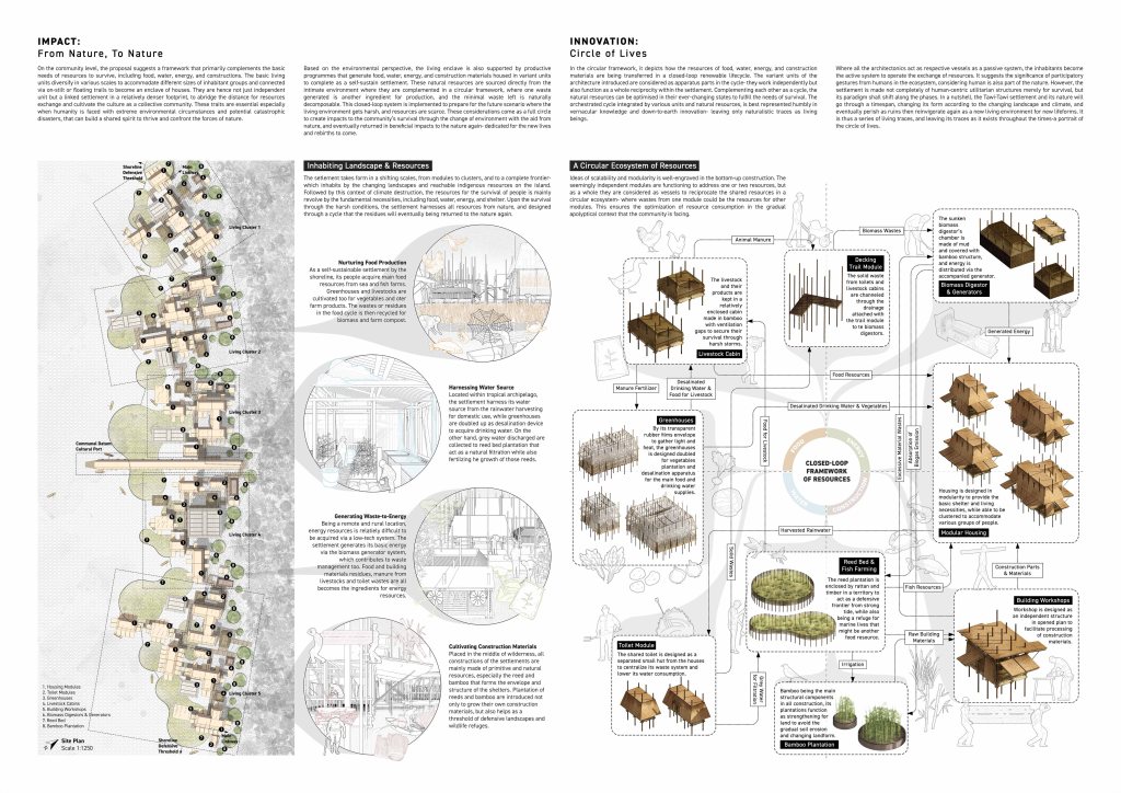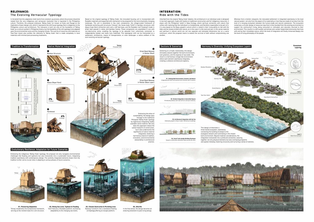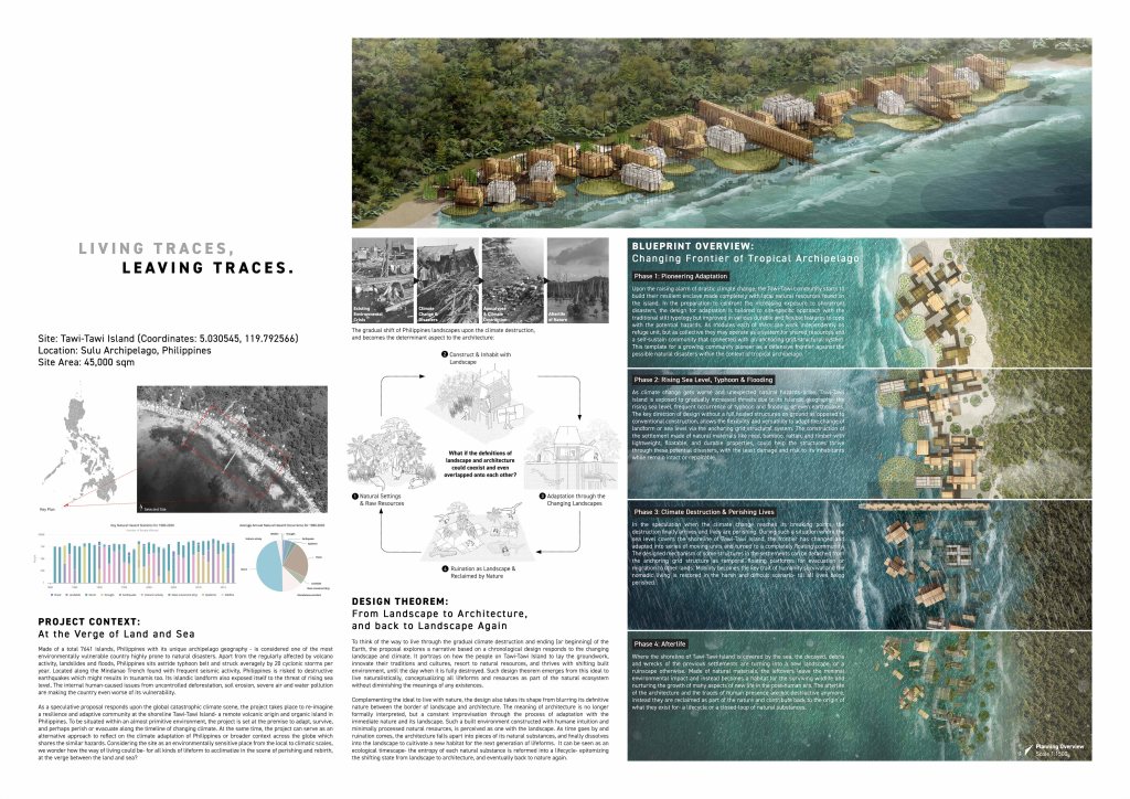 To think of the way to live through the gradual climate destruction and ending (or beginning) of the Earth, the proposal explores a narrative based on a chronological design responds to the changing landscape and climate. It portrays on how the people on Tawi-Tawi Island to lay the groundwork, innovate their traditions and cultures, resort to natural resources, and thrives with shifting built environment, until the day when it is fully destroyed. Such design theorem emerges from this ideal to live naturalistically, conceptualizing all lifeforms and resources as part of the natural ecosystem without diminishing the meanings of any existences.