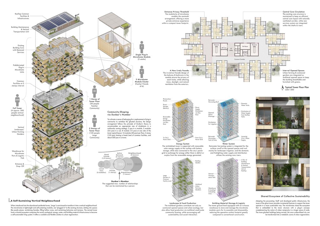 When introduced into the abandoned residential tower, ‘Jenga’ is envisioned to transform it into a vertical neighbourhood. The microhomes in lightweight and self-sustaining modules, are “plugged in” to the existing structure, slotting into spaces like puzzle pieces- revitalizing facades, filling hollow cores, and reclaiming balconies and terraces. The revived tower hosts a shared ecosystem comprises the social, ecological, energy, water, and building material infrastructures to become a self-sustainable living system. It offers a scalable and flexible solution to urban regeneration.