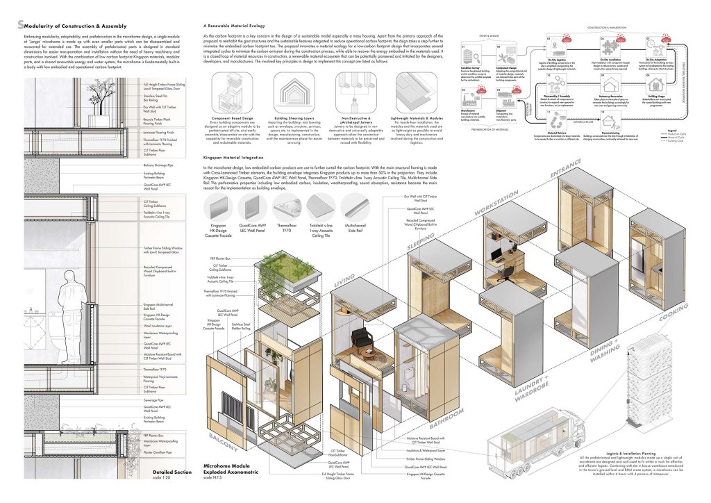 Embracing modularity, adaptability, and prefabrication in the microhome design, a single module of ‘Jenga’ microhome is made up with even smaller parts which can be disassembled and recovered for extended use. The assembly of prefabricated parts is designed in standard dimensions for easier transportation and installation without the need of heavy machinery and construction involved. With the combination of low carbon footprint Kingspan materials, modular parts, and a shared renewable energy and water system, the microhome is fundamentally built in a body with low embodied and operational carbon footprint.