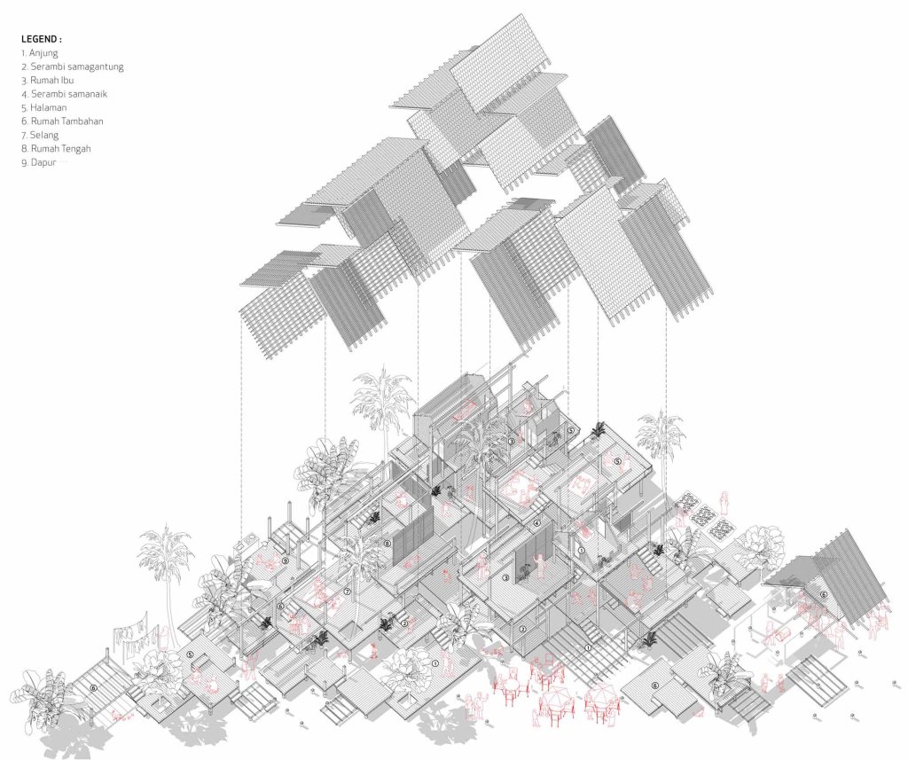 ‘Kampung’ refers to small and traditional villages, naturally pioneered by the indigenous people into a reciprocal neighbourhood. The ‘Kampung’ represents the root of origin, the land of memories to every Malaysian. It is the profound emblem which lies within the identity of our country, as well as the architecture of it. Kampung House is the native and domestic model of archetype in Malaysia’s context. The houses are primitive yet adaptive towards its environment, function, users, and cultural landscape. This proposal will further explore the architectural potential and innovative interpretation from the original model of Kampung House. The design aims to: [1] To create a new form of transparent & permeable house; [2] To reinvent more flexible & adjustable model based on tradition of which includes architectural heritage, social culture, and method of constructions; [3] To analyze & reorganize the functions of a kampung house in multiple ways to create a living complex with local cultural significations.