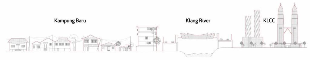 The location for this future house is in Kampung Baru. Kampung baru were chosen as the site location due to its nature. Compared to the rapidly developing Kuala Lumpur, time seems to stop in Kampung Baru. This 120-years-old village bustling with food, culture, and the nightlife is administered as a Malay Agricultural Settlement (MAS) and covers 120 ha of the city centre. In this quaint town, one can find hidden gems of beautiful Malay house architecture and the laid back kampung lifestyle with a picturesque backdrop of the iconic Petronas Twin Towers.