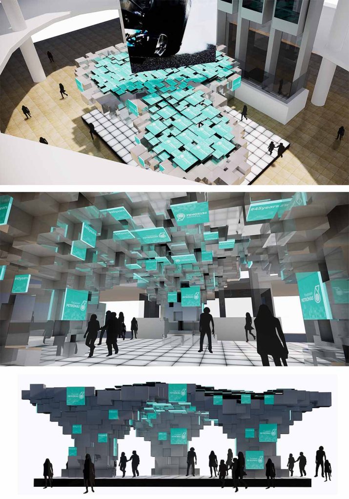 Architectural interpretation of this design originated from the imagination of a dystopian reality where digital trees grows contemplating the content of AV display. The reflecting surface of the pavilion creates a surreal experience for the public passes by the Suria KLCC Concourse and drawing their curiosity. Whereby it also tries to camouflage to its surrounding.