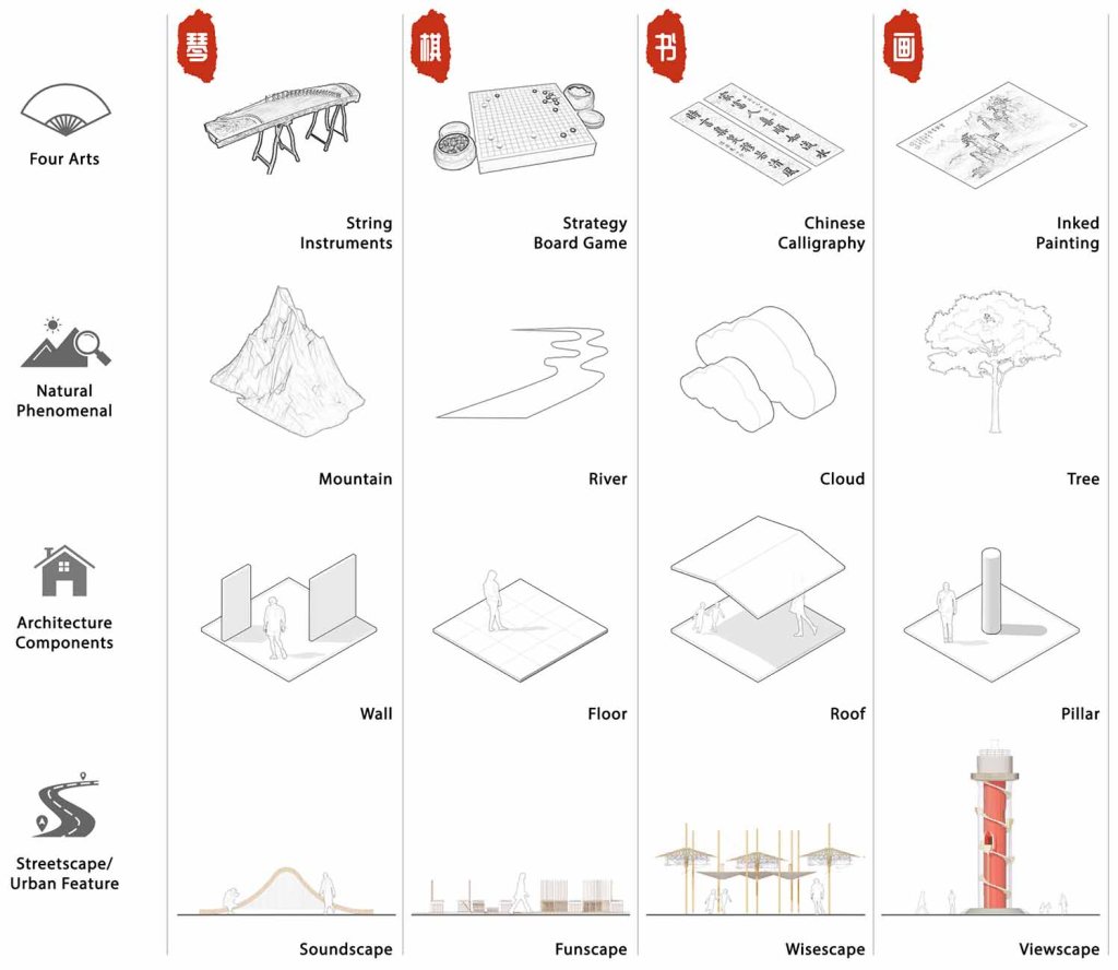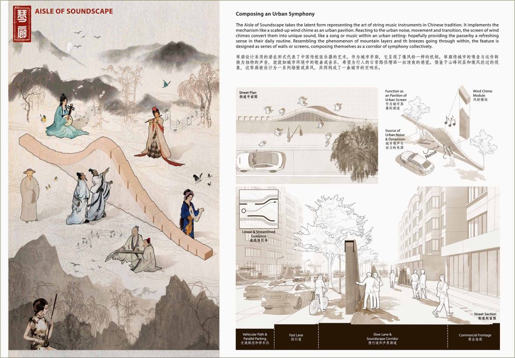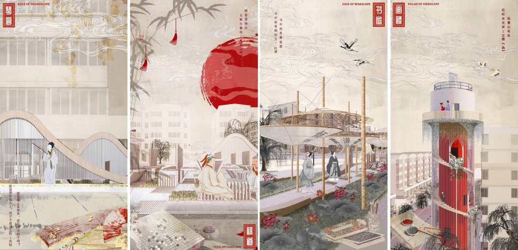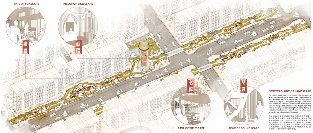 Parallel to the concept of a territory of wellness, the design is originated from the idea of Four Arts in Chinese tradition, including the music, chess, calligraphy, and painting, which usually portrays self-composure and inner peace. These arts are being reinterpreted into taxonomy of streetscapes with various qualities: Soundscape, Funscape, Wisescape, and Viewscape. They come as a diverse totality, resembles the serial imageability of the wall, flooring, canopy, and pillar. They unified with the people’s territory, their daily rendezvous, and ended with the restored tower. By redefining the habitual traces of the community situated amidst the urban axial nave, the lifeline become a pause, a relief, and a fresh breath to the city.