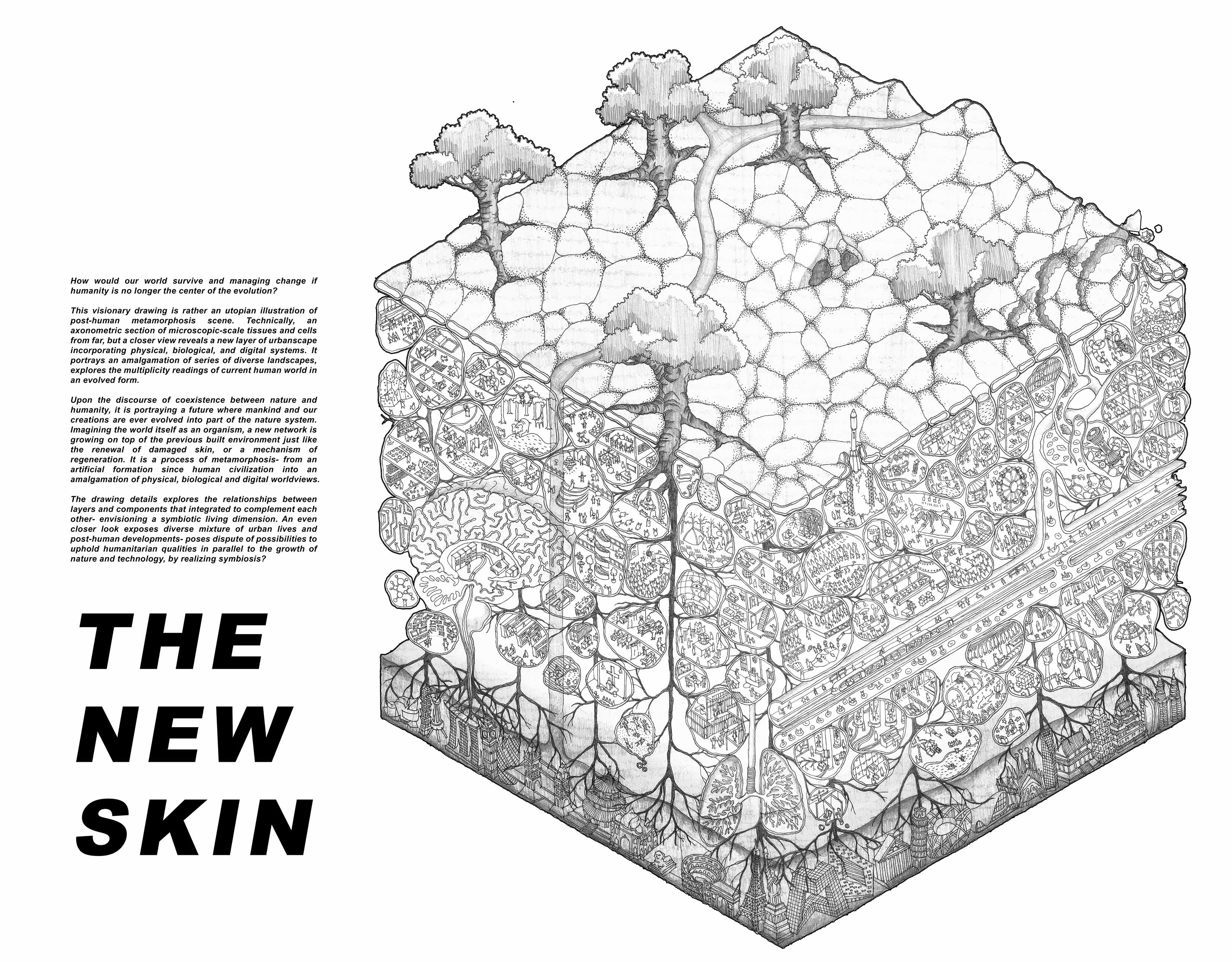 This visionary drawing is rather an utopian illustration of post-human metamorphosis scene. Technically, an axonometric section of microscopic-scale tissues and cells from far, but a closer view reveals a new layer of urbanscape incorporating physical, biological, and digital systems. It portrays an amalgamation of series of diverse landscapes, explores the multiplicity readings of current human world in an evolved form.