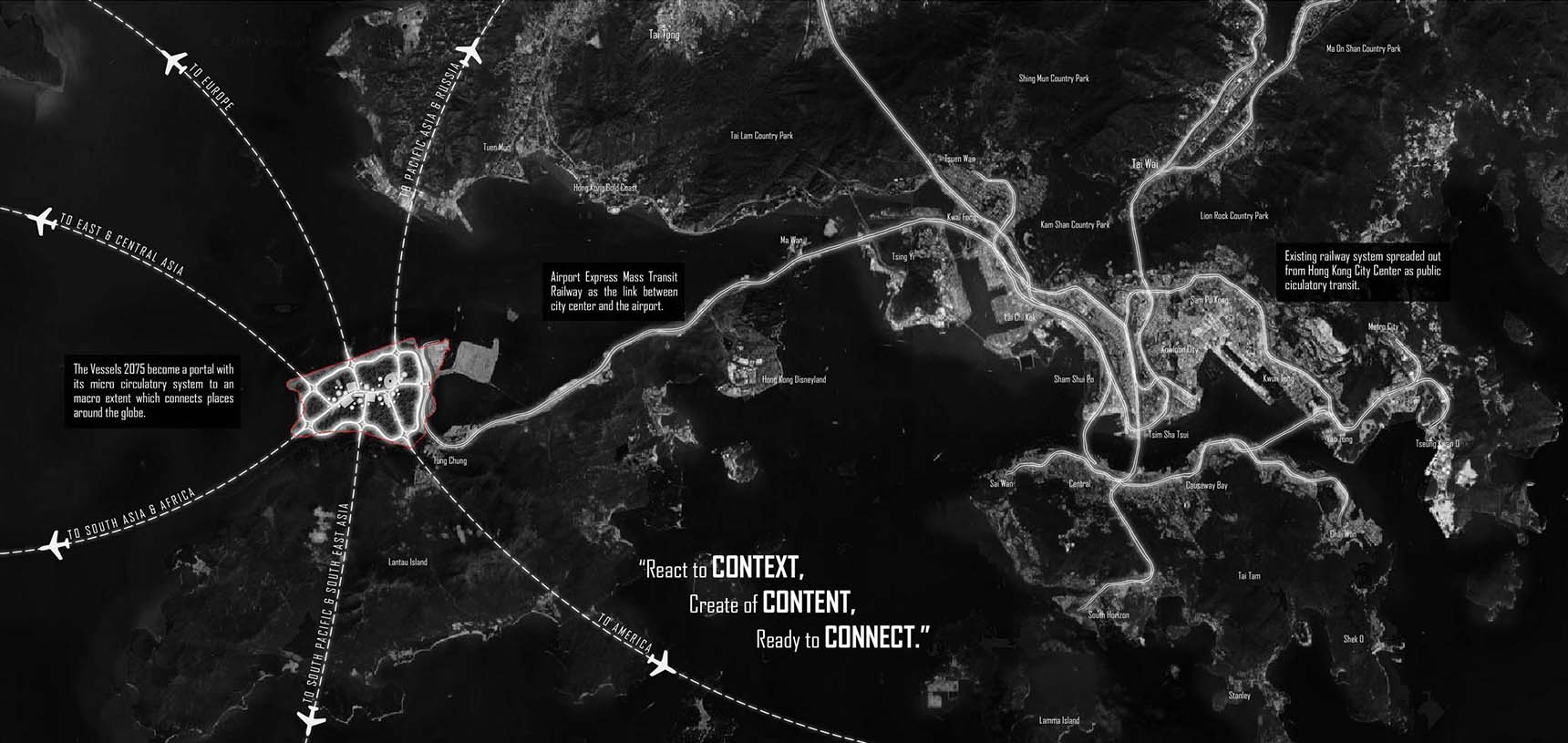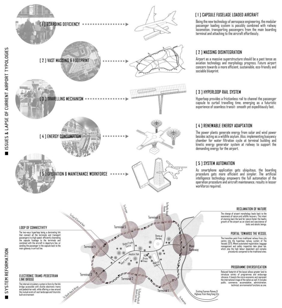 The great leap in technology advancement would manifest a subversive paradigm transformation towards current airport morphology, from a centralized mass into a vessels-like network. While refraining the inefficiency of turnaround, vast runways, long travel distance, huge labor force, convoluted programmed and so on, the new model suggest a seamless transition from rail to flight- elementary yet expeditious. This gesture is denying the airport as an isolated system in the collective locomotion structure, bringing aviation closer to our regular transit as an unification where we expect a new civic role. This notion adopt the ideology of Hong Kong as a capital of movement and efficient, being a creation of international identity.