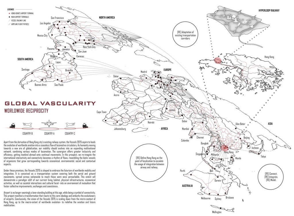 Being a well-developed metropolis, Hong Kong is articulated with bustling rail transport despite its archipelago geographic. Whereas the future of railway might evolved into Hyperloop, which is a new mode of railway transportation proposed by Elon Musk in 2012 that runs through pressurized sealed tube efficiently without resistance. Meanwhile, capsule fuselage loading system is emerged as one of the future development of aviation technology. Contemplating the existing vestiges until 2075, we envision the possibility of a synthetic amalgamation- the integration of Hyperloop tube system and capsule fuselage technology.