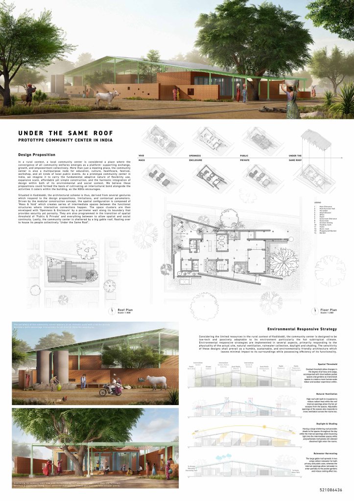 Situated in Kodidoddi, the architectural scheme is thus, derived from several gestures which respond to the design propositions, limitations, and contextual parameters. Driven by the modular construction concept, the spatial configuration is composed of ‘Mass & Void’ which creates series of intermediate spaces between the functional structures where interactive connections happen. The space clusters are then enveloped with ‘Openness & Enclosure’ by a perimeter wall along its boundary that provides security yet porosity. They are also programmed in the transition of spatial threshold of ‘Public & Private’ and everything between to allow spatial and social continuity. Lastly, the community center is sheltered by a big gable roof, floating over to house its people collectively ‘Under the Same Roof’.