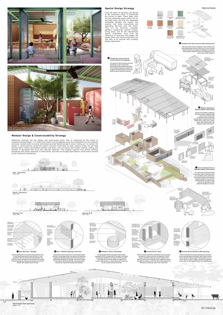 Modularity becomes the key design and construction basis, that is supported by the notion of component-based design. It is made with smaller and manageable parts that assembled into the complete structure, framed under an evenly distributed grid and dimensioning for easier setting out. In overall, the design is constructed by reinforced cement concrete raised floor as base, ceramic bricks for non-load bearing walls, timber and bamboo windows and doors, iron structures and frames, metallic roofing, and finished or decorated with local and recycled materials. This attempt requires less skillful building techniques and allows tolerance in construction, and even encourages participatory construction process by the community themselves.